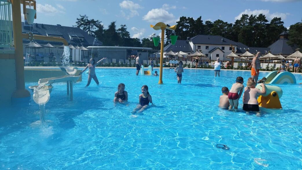 Park Wodny - do dyspozycji 5 zjeżdżalni, strefa basenowa poziomowana do głębokości maksymalnej 2 m, spray park (rekreacyjna strefa z niewielką ilością wody z interaktywnymi zabawkami i armatkami wodnymi), oraz strefa wypoczynkowa z leżakami i parasolami